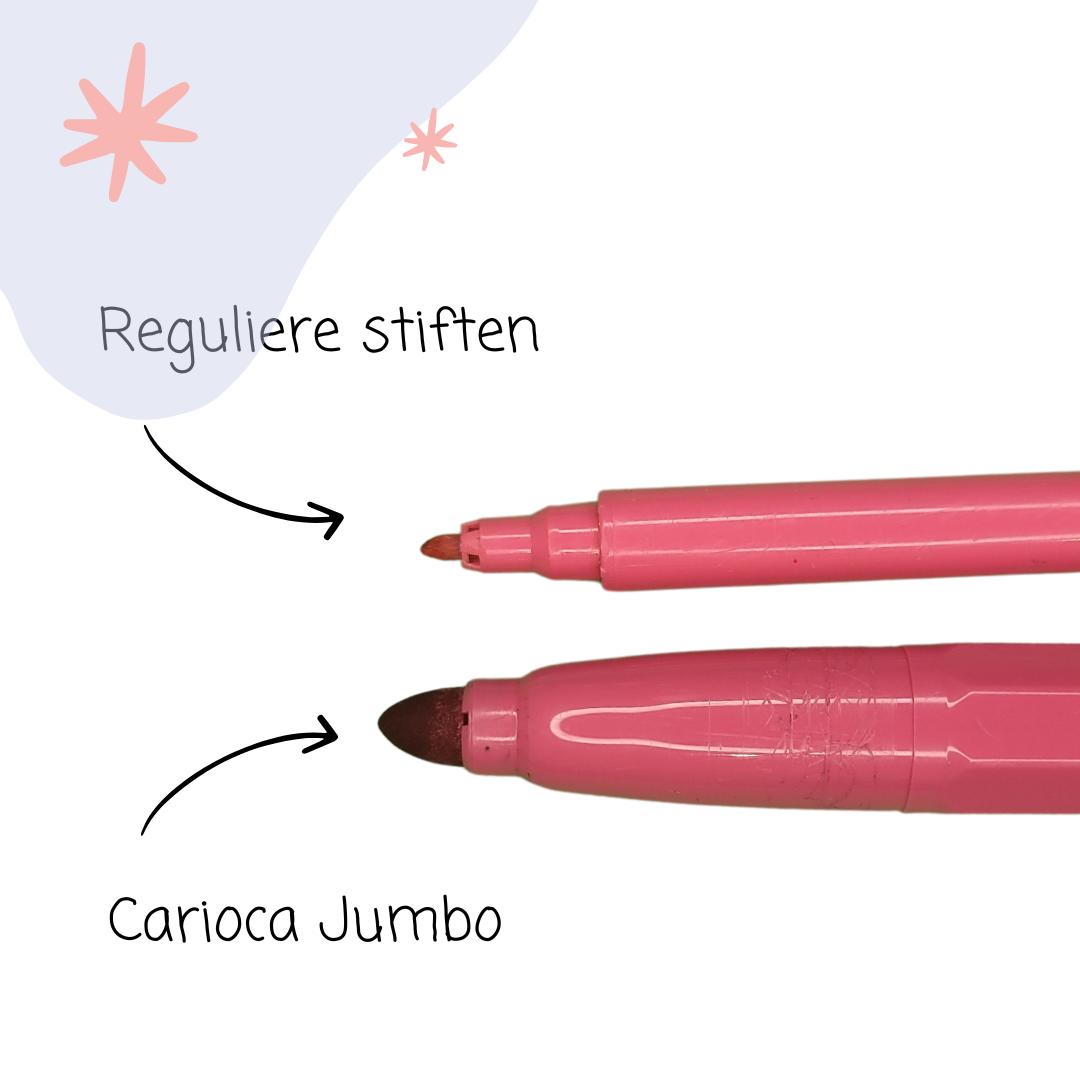 De Carioca Jumbo-stiften liggen, zeker voor jongere kinderen, gemakkelijker in de hand en zijn fijn in gebruik. Door de dikkere punt heeft je kind ook minder frustratie tijdens het kleuren, want je kunt een groter oppervlak kleuren in minder tijd.