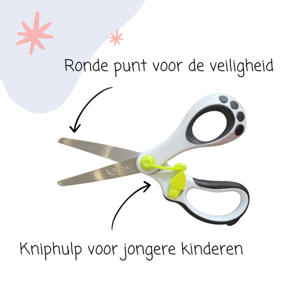 Door zijn help systeem leert jouw kind de eerste stappen tot zelfstandig knippen. Kleine kinderen hebben vaak moeite met het maken van een knipbeweging. Zeker als het gaat om het openen van de schaar. Daar heeft Maped iets op bedacht. Door het help stysteem hoeft je kind alleen de knip beweging te maken, na het knippen zal de schaar zich weer automatisch openen.