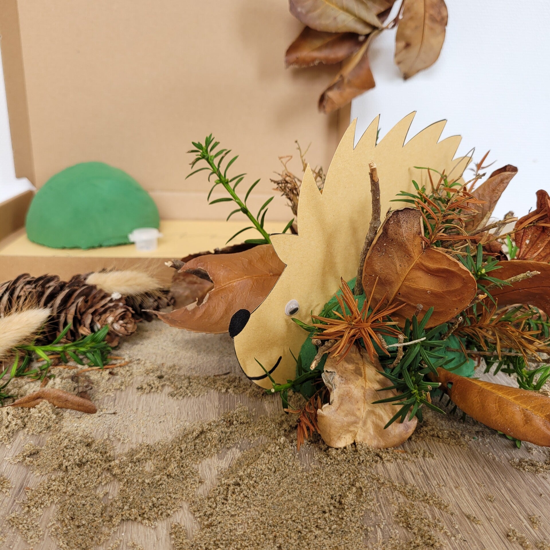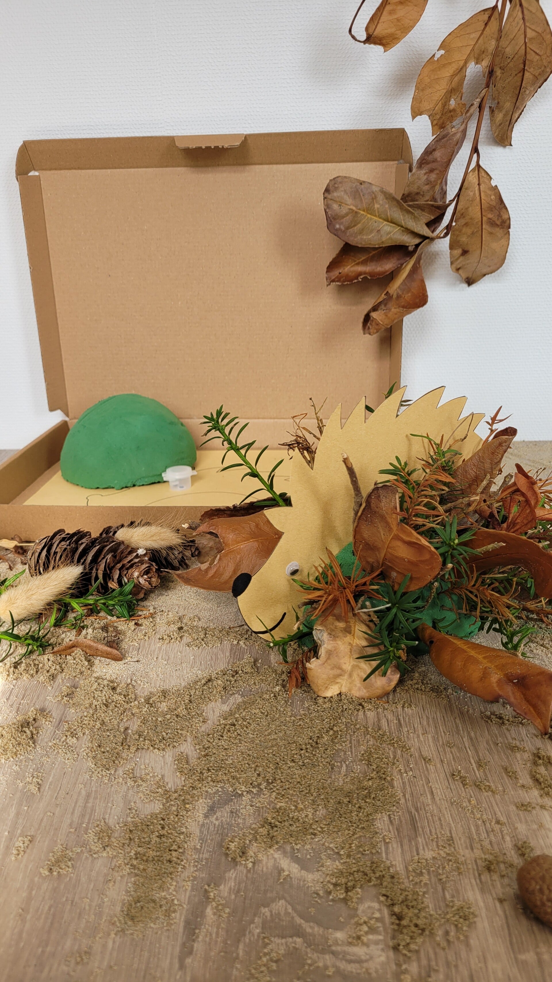 En dan begint misschien wel het leukste deel: naar buiten! Neem je egeltje mee het bos in, of maak een herfstwandeling in de buurt. Samen verzamel je takjes, bladeren, mos of eikeltjes. Alles wat je tegenkomt, kan gebruikt worden om de egel een prachtige herfstvacht te geven. Steek de vondsten in de oase en zie hoe je egeltje verandert in een stoer bosdiertje met een unieke, natuurlijke look. Geen enkel egeltje wordt hetzelfde, en dat maakt deze activiteit extra bijzonder.