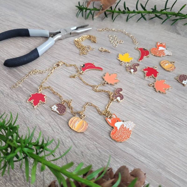 In het pakket vind je een ketting, een armband, slotjes, een verlengstukje en kleine ringetjes om de bedels vast te zetten. Daarnaast zitten er negen verschillende bedels bij, geïnspireerd op de herfst: een vos, een egel, een eekhoorn en verschillende herfstbladeren. Samen met de bijgeleverde instructie en het tangetje kun je stap voor stap je eigen sieraad samenstellen.