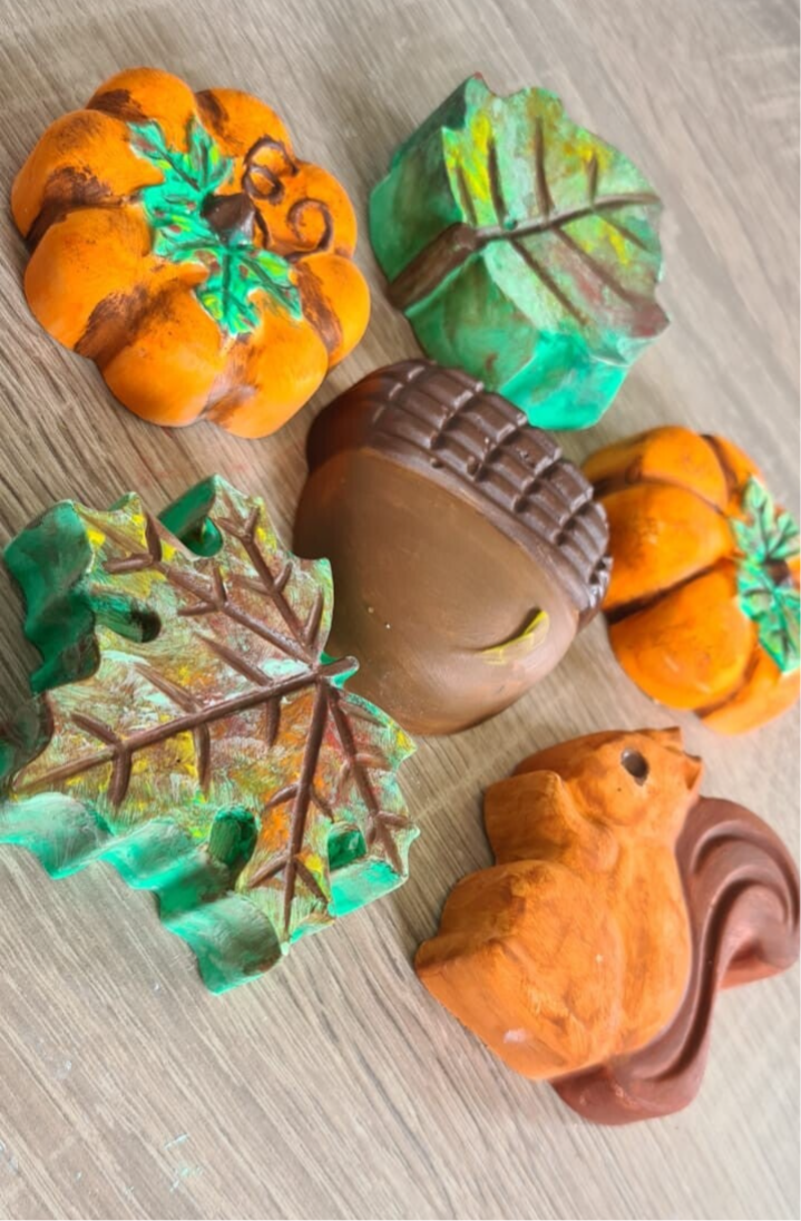 Zes gipsen beeldjes in het thema herfst: pompoenen, bladeren, eekhoorn en eikels.