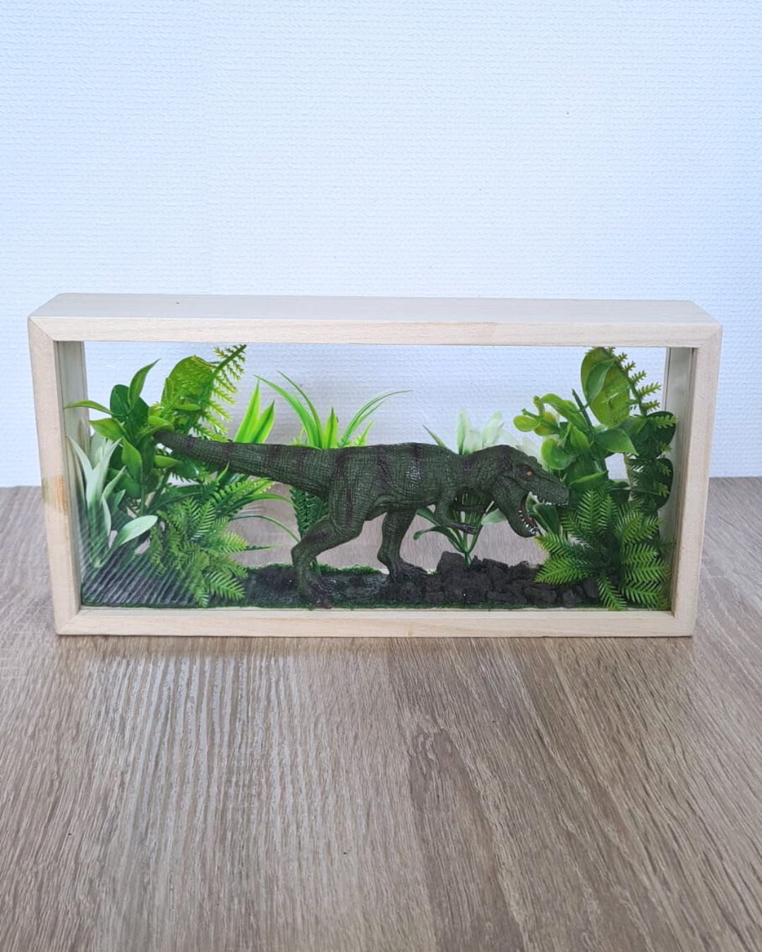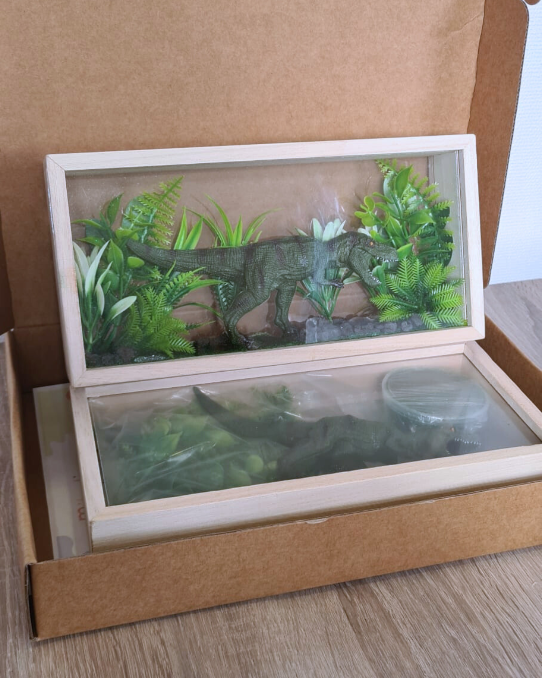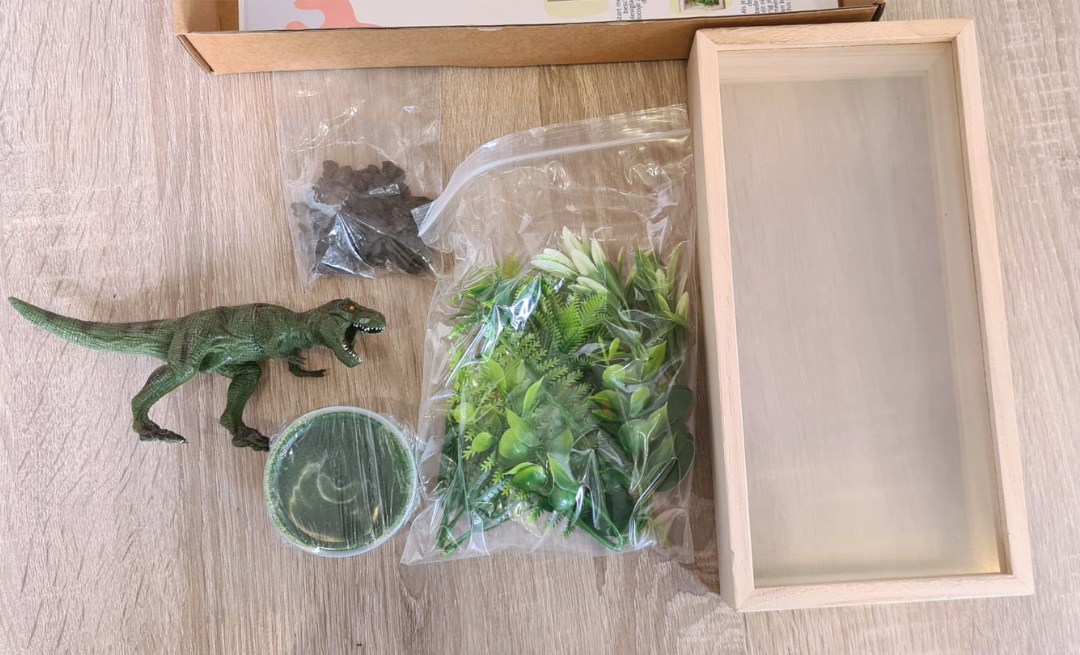 In dit pakket maak je een diorama met een T-rex, compleet met kunstplantjes en steentjes. Alles krijgt een vaste plek met de bijgeleverde gras-klei, waardoor er niets los door het huis slingert. Geen lijm nodig, geen voorbereiding, gewoon openen en beginnen.