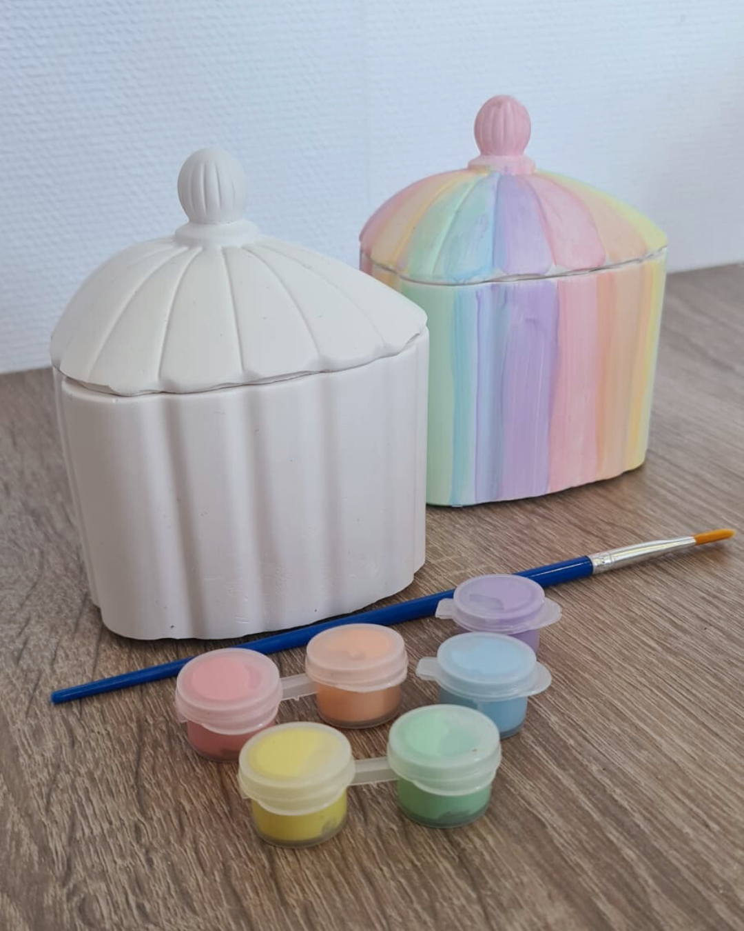 Het bakje is 8 × 7 × 9 cm en heeft een dekseltje dat mooi aansluit. Dankzij de zachte pastelkleurige verf en het overzichtelijke ontwerp is dit een fijn project voor jonge kinderen. Alles zit in het pakket, dus je kunt direct beginnen zonder voorbereiding.