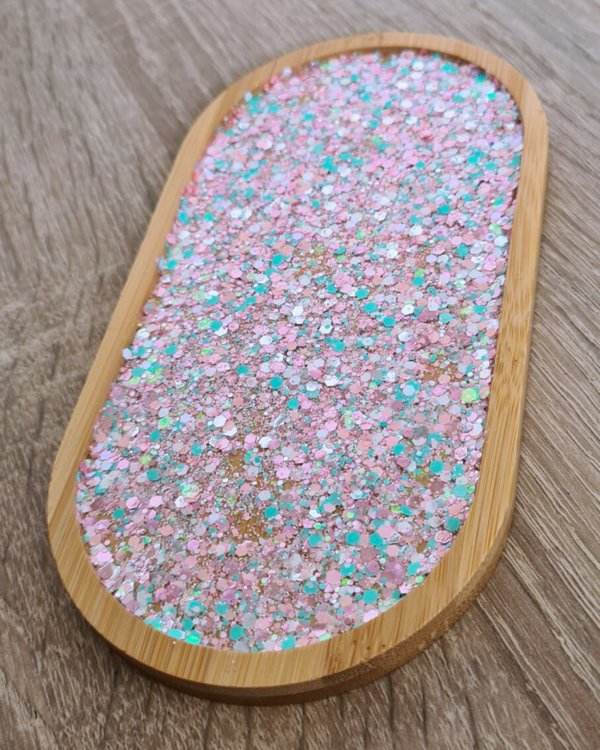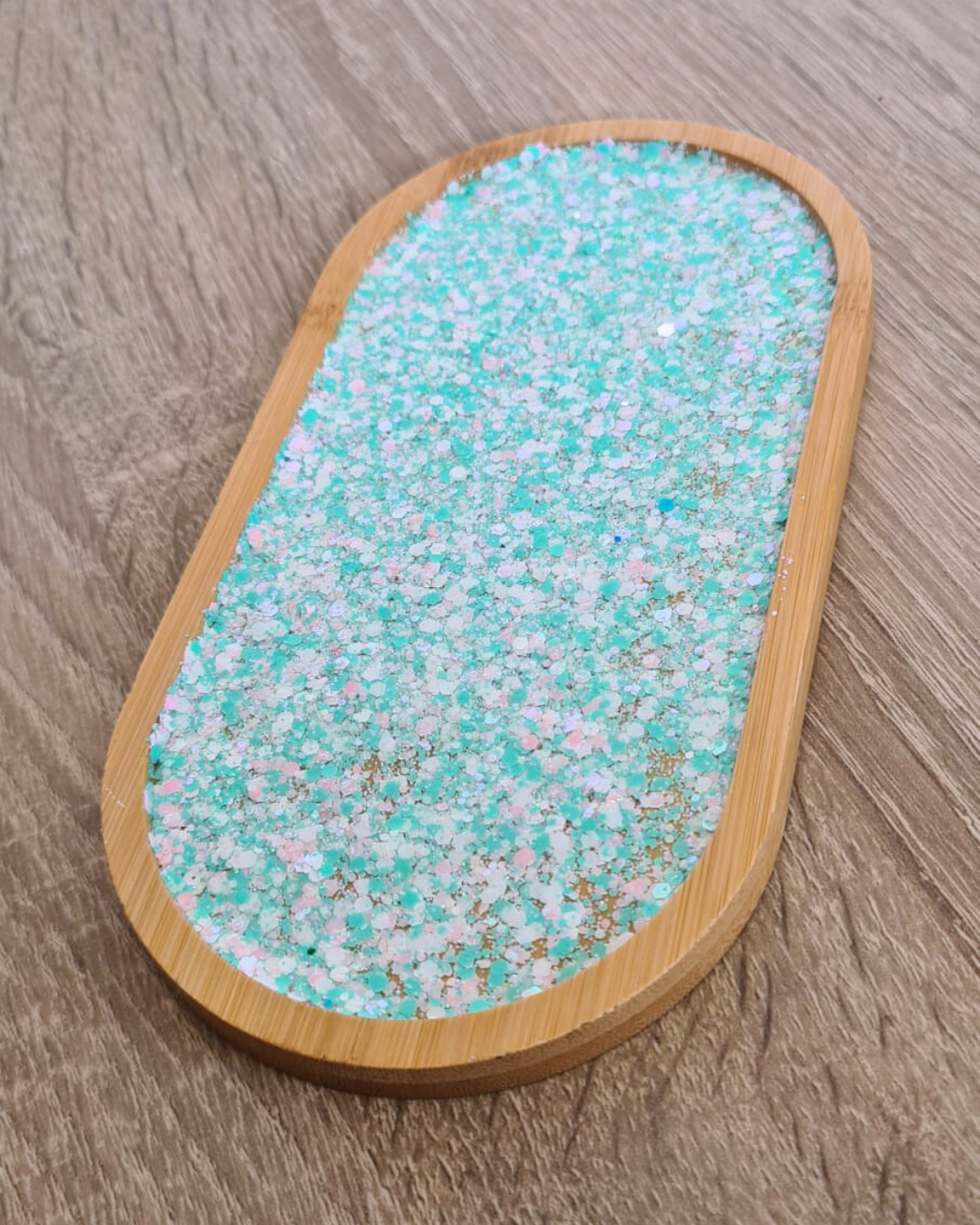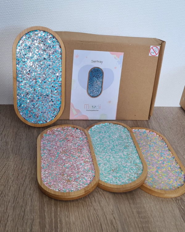 De tray is 17,5 × 9 cm en 1 cm dik en wordt versierd met glitters en kindvriendelijke Mod Podge. Met het kwastje brengen kinderen laagje voor laagje hun ontwerp aan. Het knutselen zelf is een kort, overzichtelijk moment; door de droogtijd wordt het project vaak verdeeld over meerdere momenten.
