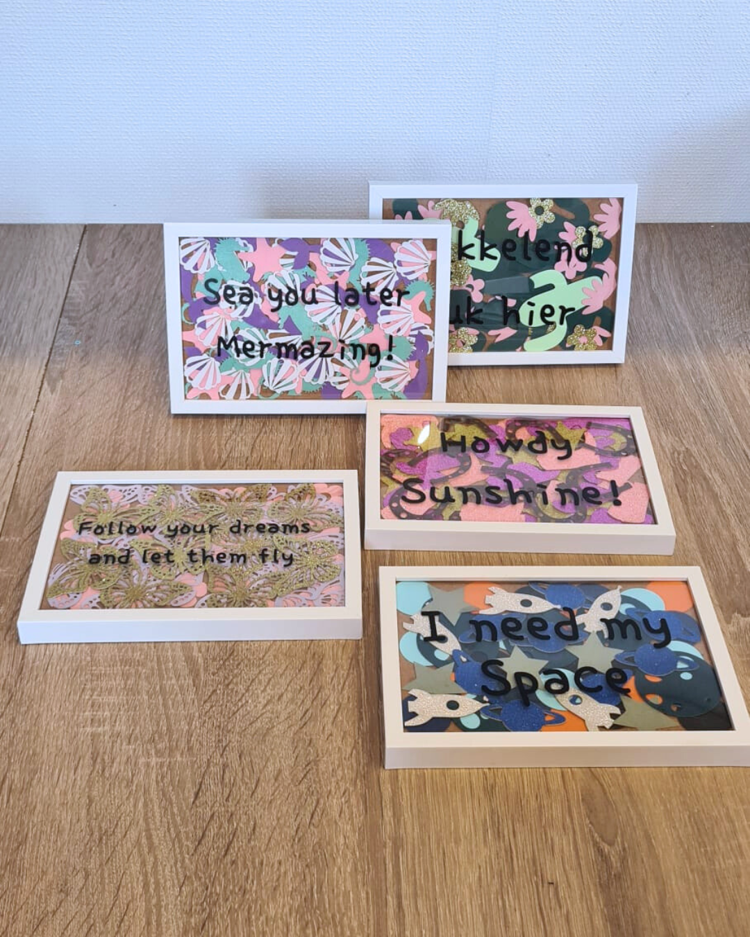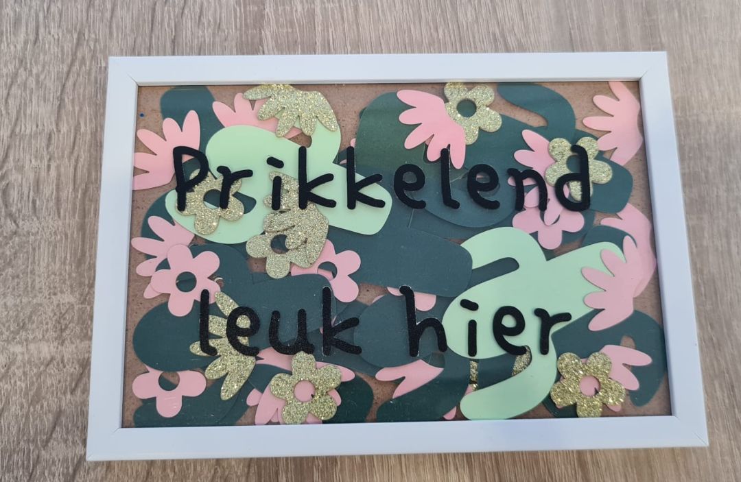 Het knutselen is eenvoudig en overzichtelijk: kinderen plakken eerst de confetti op het lijstje en daarna de bijpassende tekst. Het pakket zorgt voor een creatief moment zonder rommel — geen knoei doei, maar wel netjes en rustig werken.